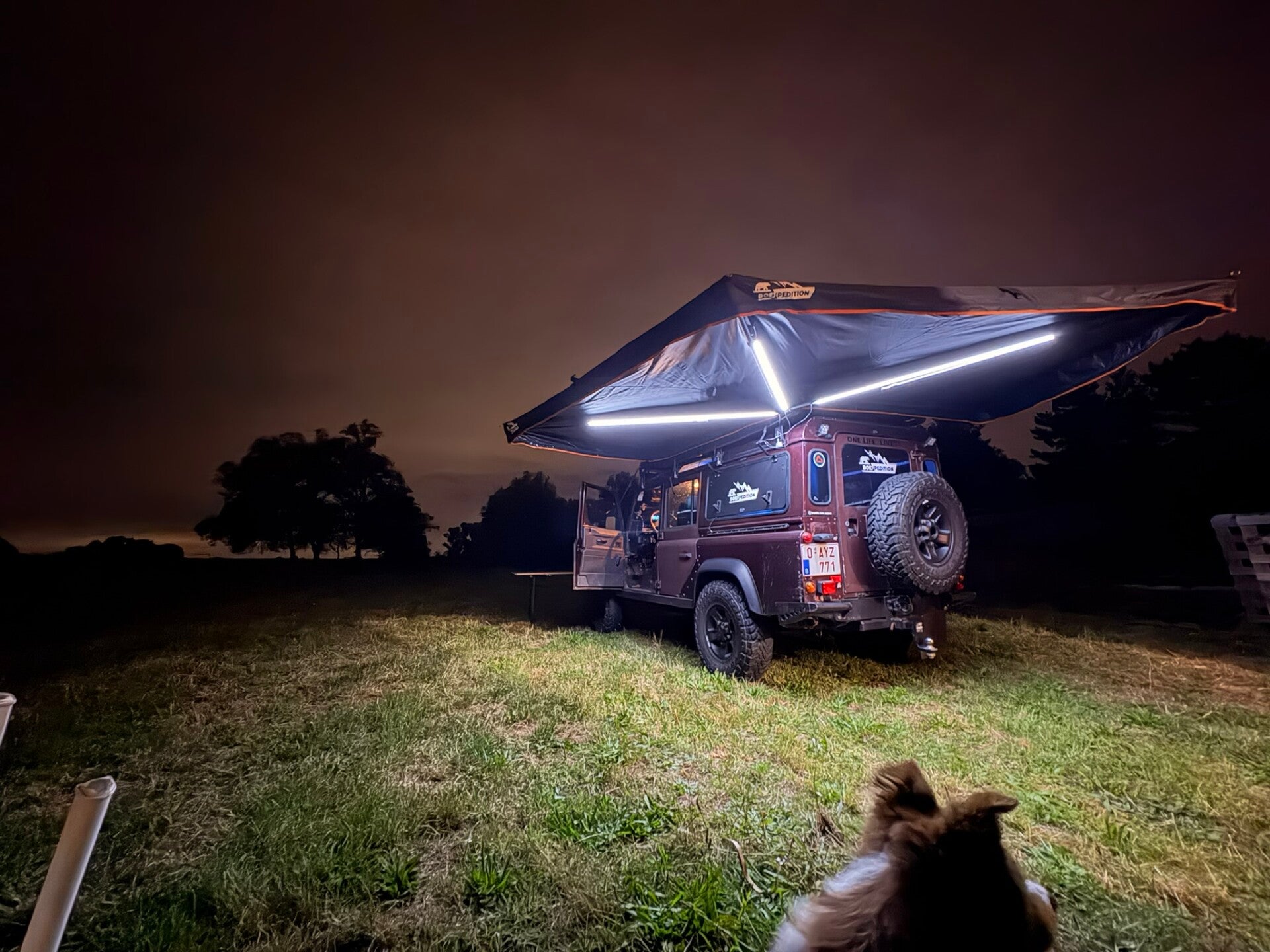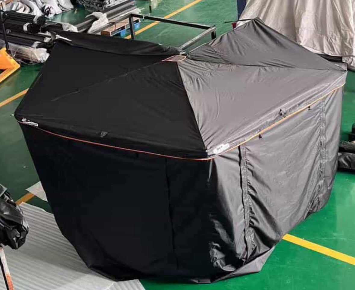Luifel Zwart-oranje 270° (2m) Freestanding. Uitklapbare poten indien onderzeil of extreme wind.